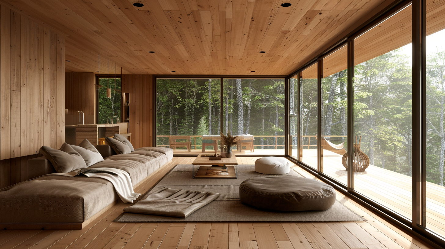 木目を活かした外観に、大きなガラス窓を組み合わせることで、自然と調和する落ち着いたデザイン。森の中の別荘に最適です。